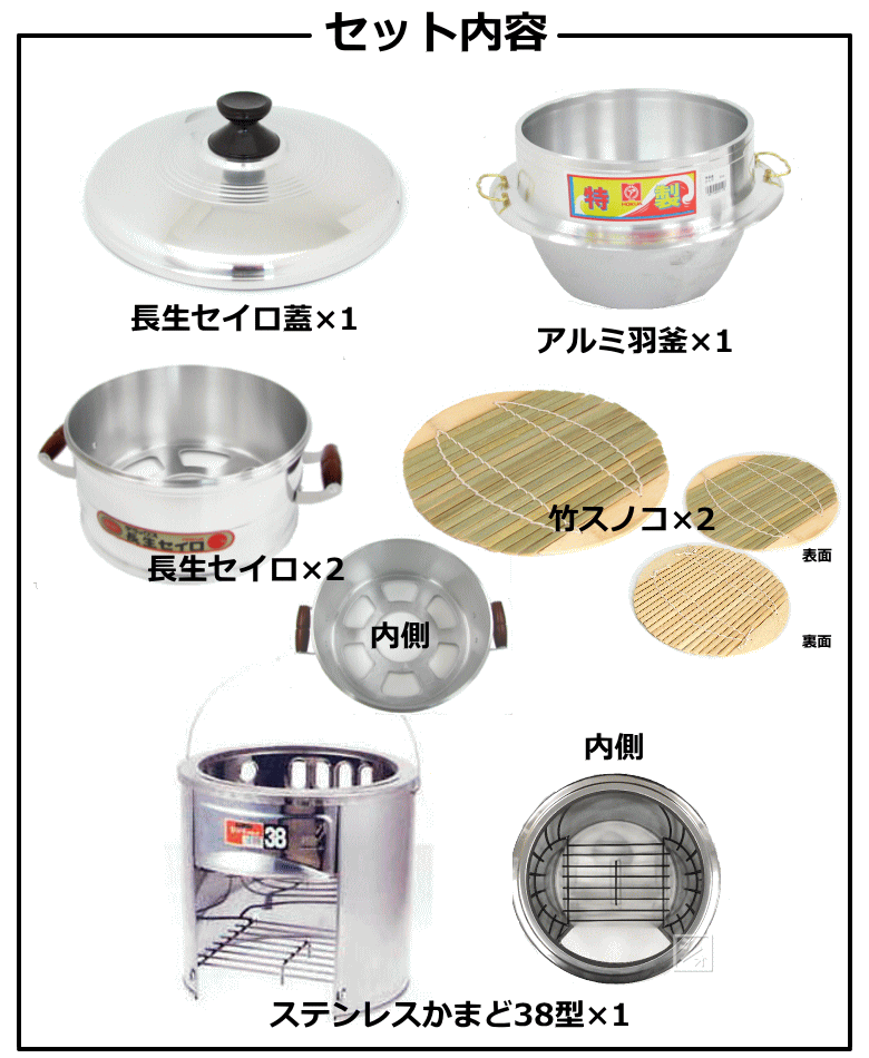 商 品 説 明 セット内容 ステンレスかまど38型アルミ羽釜30cmアルミ鋳物長生セイロ30cm (竹スノコ付) 2個セイロ蓋30cm セイロ炊量 3升(1段) 特長 ●本品は、かまど・羽釜・セイロのセット商品です。